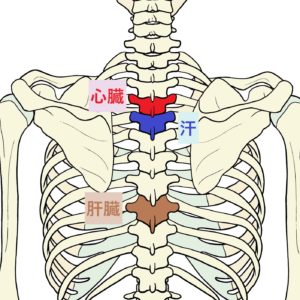 整体の技術による改善方法では自然と目的の箇所をゆるませるため、特に解剖や関連性などを知らなくても大丈夫ですが一応解説しておきます。心臓と関係する背骨と体温調整を行う背骨は隣り合っており、胸椎4番目と5番目の骨で肩甲骨真ん中くらいの高さにあります。肝臓と関係する椎骨は胸椎9番目の骨になります。