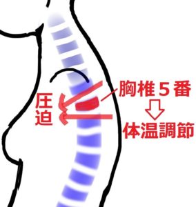 乾燥症も冷え性の大きな原因になりますが、体の水分調整も体温調整も、どちらも胸椎5番と関連するため以下の対処法で共に改善させることができます。