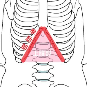 イラストは極端ですが、肋骨が全体的に硬くなってしまうと、肩で呼吸するしかなくなります。そこまで酷くない場合は、おへその下に手のひらをあてて、呼吸がそこまで入るかどうかで判断できます。