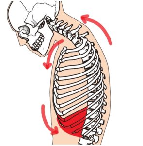 季肋部が硬直すると、胸を張った良い姿勢も出来なくなり、さらに肋骨(肺)に負担を掛けて悪循環に陥ります。