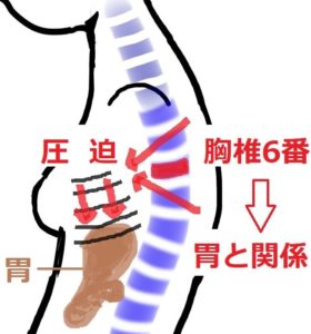 - 前屈姿勢が、胃と神経的に関係している胸椎6番目の椎骨を硬直させることで胃の働きが低下する