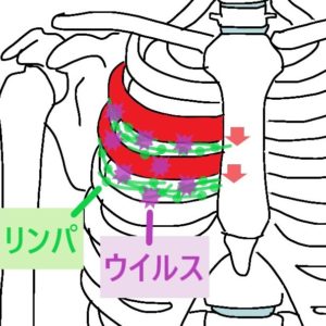 呼吸器への負担で右の肋骨が硬くなる ➡ 肋骨の一部が下がる ➡ 肋間の一部が狭くなる ➡ 肋間を走るリンパ節が圧迫されて流れが悪くなる ➡ ウイルスが発生する