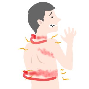 帯状疱疹の初期の症状は、体の左右どちらかの神経に沿って生じる皮膚の痛みや違和感、かゆみなどです。痛みは神経の炎症によって引き起こされます。多くは上半身にみられ、上肢~胸背部が約30%、腹背部が約20%です。顔面、特に目の周りに現れることもあります。