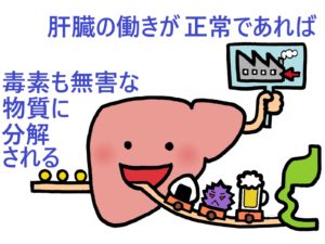 - 肝臓の働きが低下すると、解毒ができなくなる
