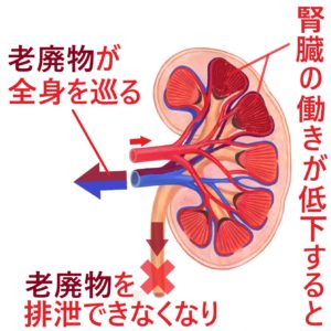 - 腎臓の働きが低下すると、老廃物を排泄できなくなる