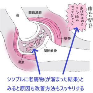 - 老廃物が溜まることで、痛みや熱(炎症)、強張りなどを引き起こす