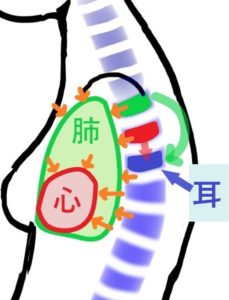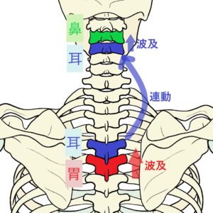 ポイントは 食べ過ぎ 或いは 肺の負担により硬くなる椎骨と、耳と関係する椎骨 が隣り合っていたり、離れていても力学的に連動することで影響しあっています。