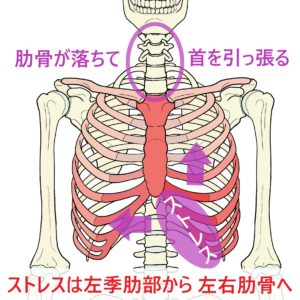 - ストレスは体にとって中毒の一種でもあり、肝臓の疲労から肋骨が硬直し、首が引っ張られて硬直する