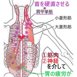 - 肩甲挙筋など、首と関係する筋肉を硬直させる