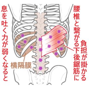 - 呼吸と関係する下後鋸筋も伸縮しないため、やがて硬直を起こし始める