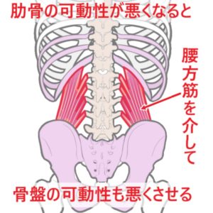- 肋骨と骨盤をつなぐ筋肉や骨盤も動きも悪くなる